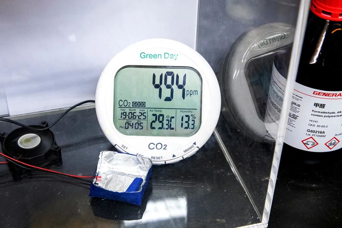 但二氧化碳检测仪上已经开始有了指数的升高,说明甲醛正在迅速分解。