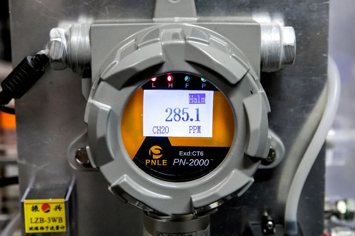 所以最开始测试的时候,在密封环境里放入甲醛后,我们没有太多时间等到甲醛反应舱的甲醛测试仪数值归零,基底浓度就是98.7ppm。