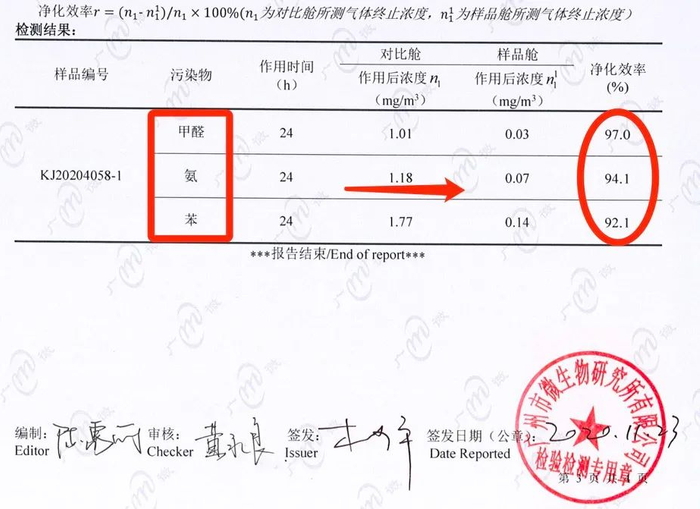 也就是说,超过国标几百倍的甲醛,55分钟就被它吃透了,化解为二氧化碳和水了。
