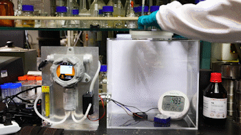 然后用移液枪从甲醛溶液中吸取 20μL,注入甲醛反应舱内的加热片上,再迅速把实验舱密封,方便让甲醛充斥在整个密封舱的空气中不会漏出。