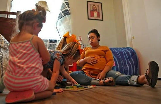 孩子们坐在餐桌旁吃着巧克力冰淇淋杯,杰西卡给香农医疗中心(Shannon Medical Center)打电话。怀孕八个月的她,将一只手放在隆起的肚子上,等待与在医院COVID-19 病房值班的护士交谈。