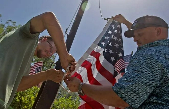 7 月 4 日,汤姆格林县法院没有升起美国国旗,集会参与者举起了自己的国旗。将美国国旗绑在杆子上的人就是凯莱布·华莱士。