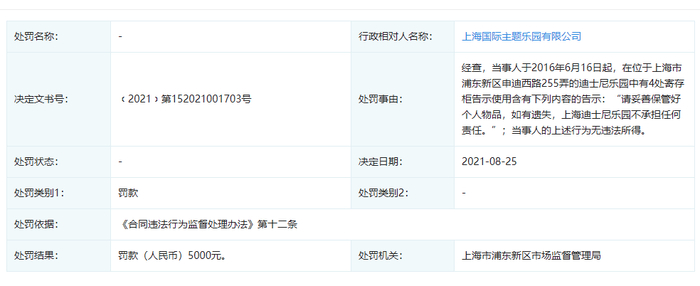 8月31日,据国家企业信用信息公示系统显示,上海国际主题乐园有限公司因关联的上海迪士尼乐园在寄存柜上张贴告示不当,日前,被浦东新区市场监督管理局行政处罚,罚款5000元。