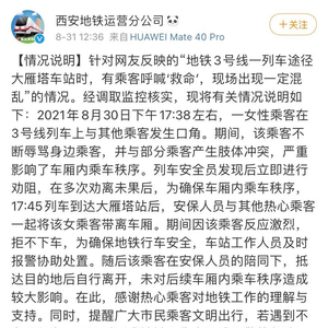 西安市地铁运营公司8月31日回应称,8月30日下午,一女性乘客在3号线行驶的车厢内与其他乘客发生口角。期间,其不停辱骂身边乘客并产生肢体冲突,严重影响乘车秩序。下午5时45分,在车辆抵达大雁塔站后,站内工作人员和热心乘客对其劝阻并试图将她带离车厢。期间因该乘客反应激烈,拒不下车,为确保地铁行车安全,车站工作人员及时报警协助处置。随后该乘客在安保人员的陪同下,抵达目的地后自行离开,未对后续车厢内乘车秩序造成较大影响。