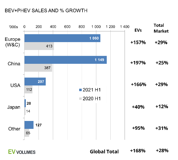 汽车行业的电动化正在以前所未有的速度推进。EV Sales近日发布的数据显示,今年上半年,全球电动汽车销量超过265万辆,同比大幅增长168%。