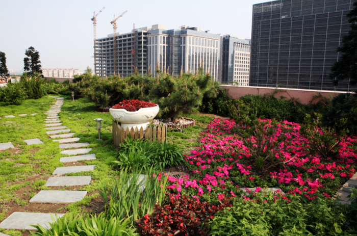 屋顶绿化就是重要的“海绵设施”之一。按降雨量600毫米计算,花园式屋顶绿化可截留64.6%的雨水,简式屋顶绿化可截留21.5%的雨水。