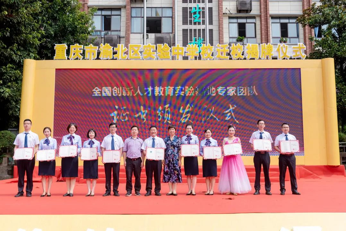 除此之外,渝北区实验中学还在演出中举行了“感动实中十大人物”、“实中创意楹联班级”的颁奖仪式,同时为全国创新人才教育实验基地专家团队颁发证书。