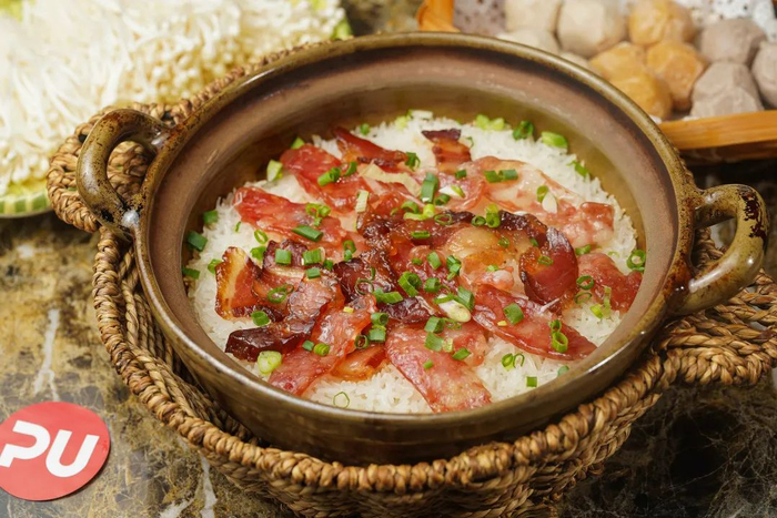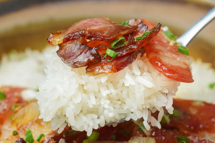 还没端上桌就香气四溢的广式腊味煲仔饭,米饭粒粒分明,咸香的腊味铺满整锅!锅底是焦香酥脆的锅巴,一口饭一口腊味,真的销魂!