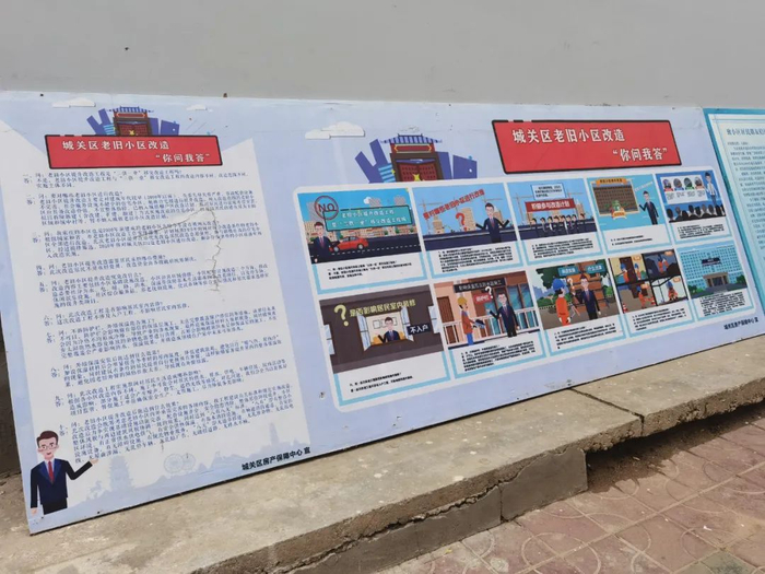 位于定西路的兰州大学二分部家属院在老旧小区改造时,现场摆放“说明板”、宣传板,得到了小区居民的一致好评。记者了解到,多块展板用图文漫画的形式,详细介绍了老旧小区改造的一系列热点问题。同时,室外电力、通信预埋工程,室外雨水、污水改造工程,室外给水改造工程,外墙保温改造等工程的施工工艺,以及选哪一类建材,什么品牌的材料,采用何种施工方法等内容,都给居民们“讲解”得一清二楚。