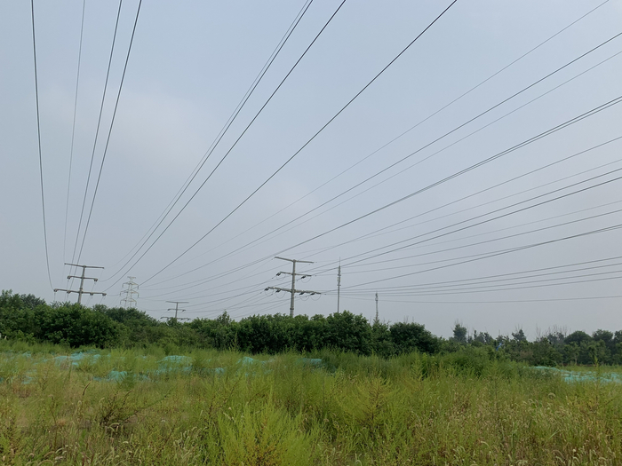 8月16日,记者来到团河南村,刚下过雨,道路潮湿泥泞。站在高压铁塔下,只见头顶上是一根根高压线,高压线正下方有一片茂密的树林。高压线在两座铁塔中间呈现一道弧线,最低位置和这些树的距离不到2米。附近村民说:“刮风时树枝甩来甩去,看着非常危险。”