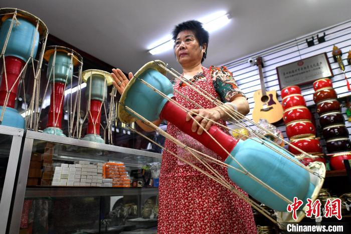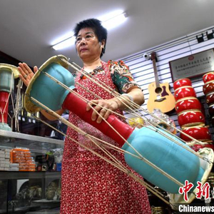 中新网福州9月3日电 (叶秋云)“邦邦邦,邦邦……”一阵阵的鼓声从位于福建省福州市台江区洋中路的百年许顺兴乐器店内响起。9月2日,“百年许顺兴锣鼓制作技艺”代表性传承人许玲正手持狼串,拍打试音。
