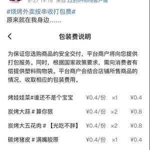据网友爆料,一些烧烤店、炸串店现在甚至按串打包收费,五花肉、鱿鱼须、娃娃菜等餐品每一串的打包费从0.4元-0.8元不等,“我一共点了12串烧烤,打包费总计5.4元。”
