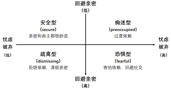 在亲密关系中,人们的表现各不相同,有人回避亲密,想多获得一些独立的时空;有人担忧被抛弃,想多听伴侣表达爱意。根据回避亲密、担忧被弃这两个维度上的不同表现,成年人的依恋类型大致可以分为以下四种: