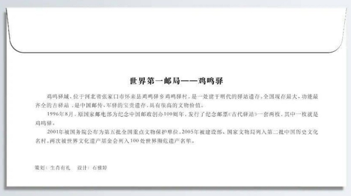 (自主开发的鸡鸣驿特色纪念封,由国家邮政集团公司邮票印制局印刷,并加盖纪念戳及1995年8月发行的《古代驿站·鸡鸣山驿》纪念邮票一枚,可以邮寄远方亲人好友,传达问候,也可收藏)