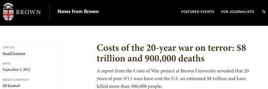 美国布朗大学(Brown University)的战争成本项目(Costs of War Project)当地时间9月1日发布的一份报告称,“9·11”事件后长达20年的战争已经使美国损失了大约8万亿美元,导致约90多万人丧生。