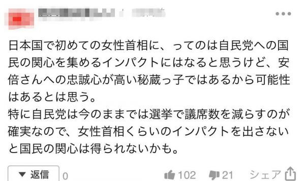 “成为日本国第一位女性首相,虽然会引起国民对自民党的关注,但她是对安倍非常忠诚的人物,所以我想还是有可能的。特别是自民党,照目前的情况发展下去,在选举中议席数势必会减少,如果不发挥女性的影响力,恐怕就得不到国民的关注。”