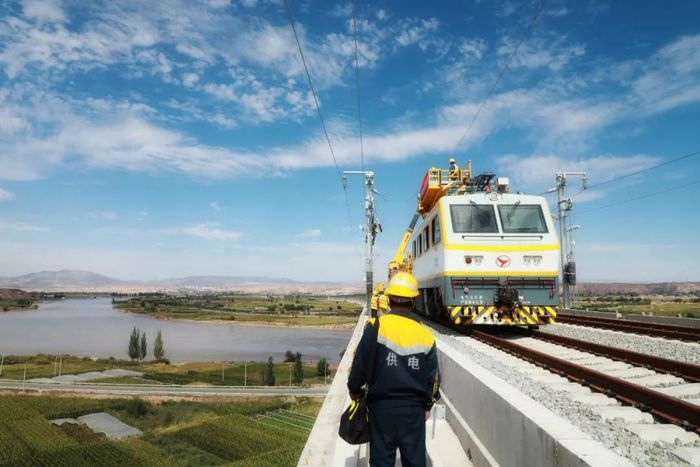 9月2日下午,新建中卫至兰州铁路客运专线牵引供电系统首条承力索导线在靖远黄河特大桥上成功架设,标志着中兰铁路接触网正式进入接触网上部组网施工阶段。