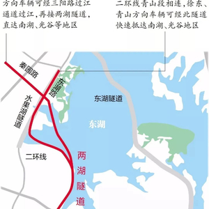 目前,武昌地区南北向仅友谊大道-中山路、二环线两条贯通性主干路,平均间距达4-5公里,两湖隧道建成后,在江南片区将形成一条南北向快速通道,可有效缓解二环线、珞狮南路、水果湖隧道等周边道路的交通压力,方便南湖、水果湖地区市民出行。