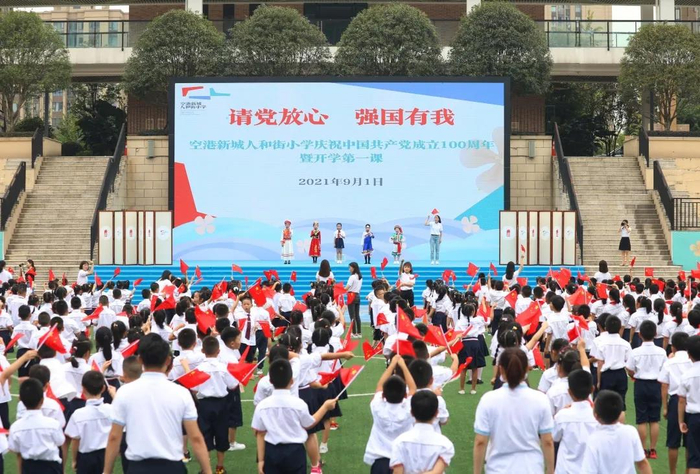空港新城人和街小学还举行了“请党放心 强国有我”庆祝建党100周年暨开学第一课。423名新生和17名新入职教师一同在国旗下重温百年党史、传递奥运精神,奏响青春之歌。