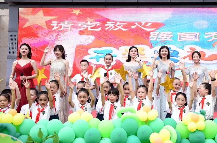 两江小学少先队员代表们齐诵《听,这就是中国的声音》,带领同学们走进党的历史,感受党的成就,表达对党的热爱;中央公园小学全体师生共同唱响《我爱你中国》,诉说着每一位教师和学子对祖国的热忱与依恋。