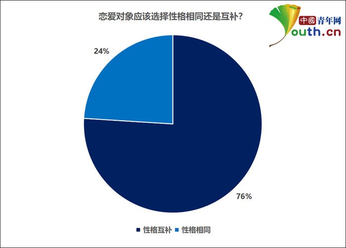 近日,中国青年网校园通讯社针对“恋爱对象应该选择性格相同还是互补”话题,面向全国515名大学生展开问卷调查,结果显示:390名大学生选择性格互补,占比76%;125名大学生选择性格相同,占比24%。