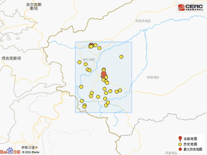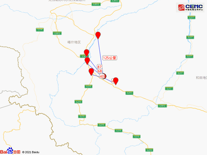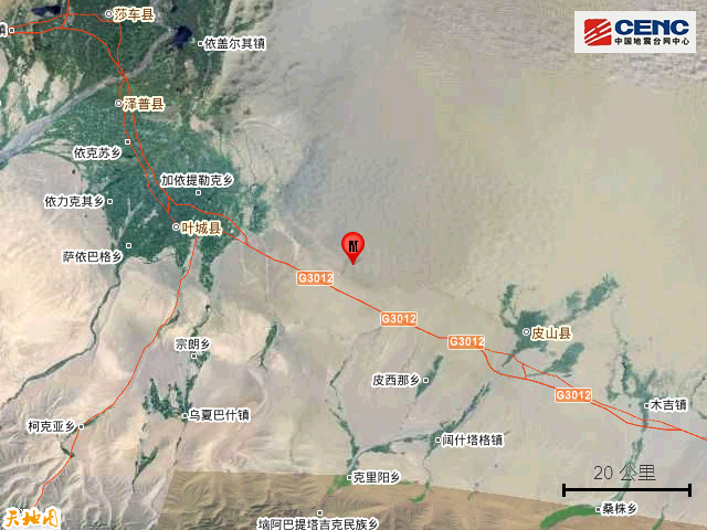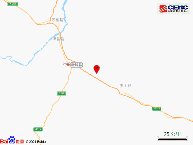 周边县城:震中距叶城县40公里、距皮山县45公里、距泽普县68公里、距莎车县87公里、距麦盖提县125公里,距昆玉市141公里,距乌鲁木齐市1060公里。