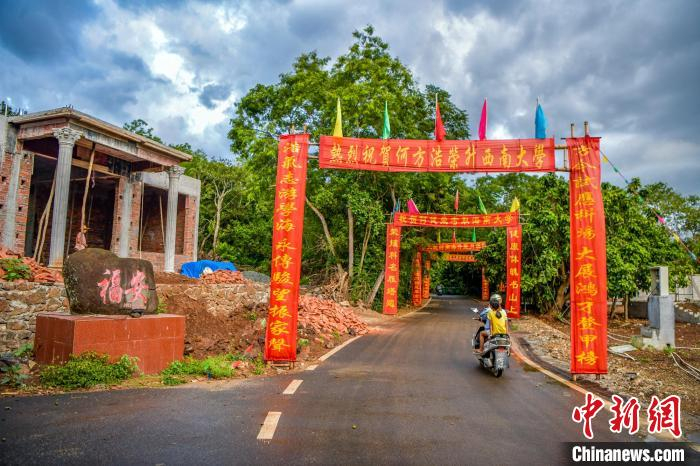 中新网儋州9月5日电 (记者 王子谦)每年高考录取时,在海南儋州广大城镇乡村随处可见这样的景象:高七八米宽三五米的“彩门”跨在村门口的乡间小路上,红布写就楹联祝贺当年被大学录取的学子。