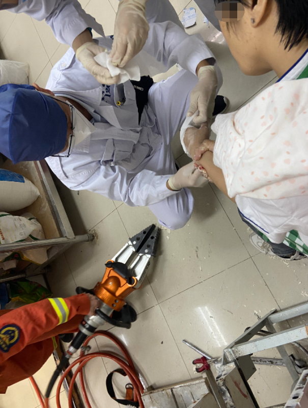 经过2分钟的紧张救援,消防指战员成功将被困人员被卡手指解救出来,同时移交现场等待的医护人员。