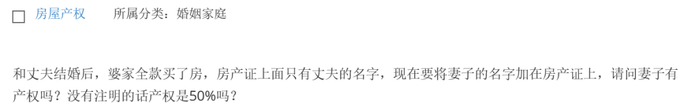和丈夫结婚后,婆家全款买了房,房产证上面只有丈夫的名字,现在要将妻子的名字加在房产证上,请问妻子有产权吗?没有注明的话,产权是50%吗?
