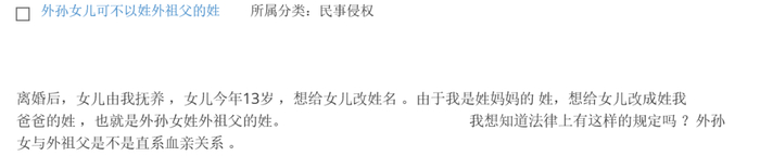 离婚后,女儿由我抚养,女儿今年13岁,想给女儿改姓。由于我是跟我母亲姓,想给女儿改成跟我父亲姓,也就是外孙女跟外祖父姓,法律上对此有相关规定吗?外孙女与外祖父是不是直系血亲关系?