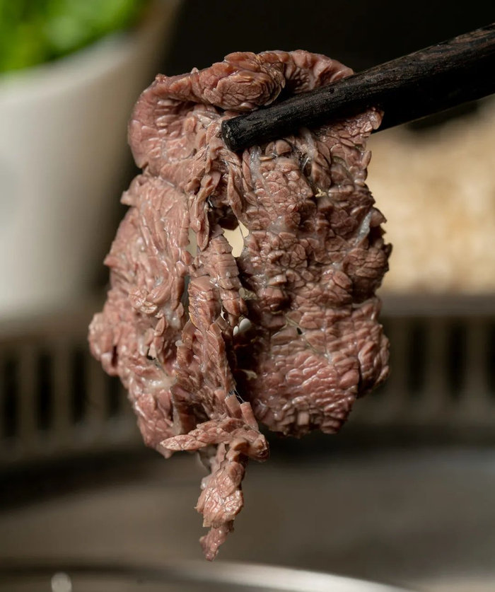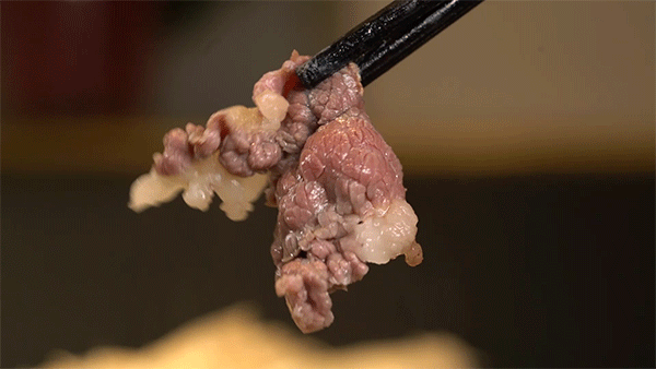 吊龙取自牛背脊的长条,新鲜现做,味道鲜美,口感分明。薄薄的一片,肉质松软,煮熟后随手一捞就是一大块,滋味充盈,细腻香滑,每一口都是浓浓的牛肉香味!