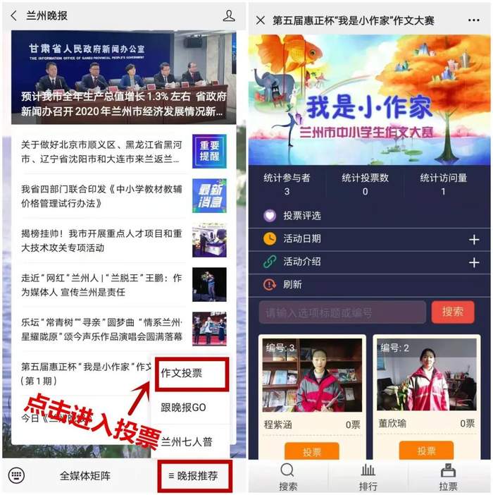 在兰州晚报微信公众平台(lzwbweixin)的“活动”菜单中,开通“作文投票频道”,您可以在这里给您认为优秀的作文投票。