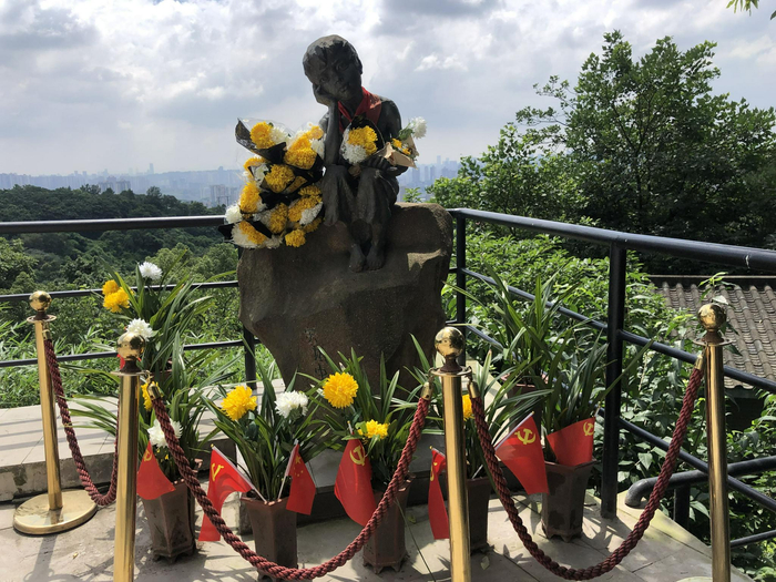 7月3日,重庆歌乐山松林坡,小萝卜头的雕像上系着红领巾,附近摆着悼念的鲜花。新京报记者 张静姝 摄