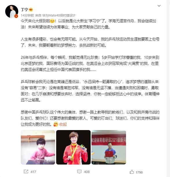 @丁宁 发文:今天来北大报到啦!以后就是北大新生“学习宁”了。学海无涯苦作舟,我会继续加油!未来希望继续为体育事业、为大家贡献自己的力量。