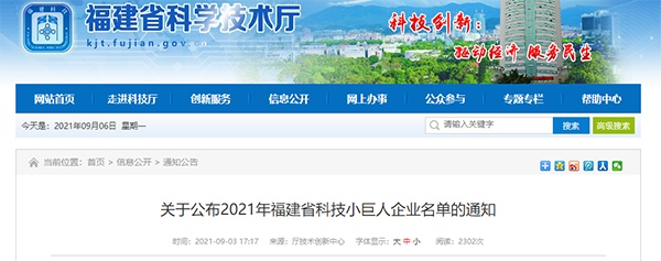 关于公布2021年福建省科技小巨人企业名单的通知