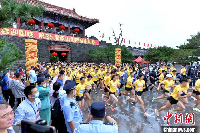 9月6日,第35届泰山国际登山比赛在山东泰安泰山脚下的岱庙广场鸣枪开赛。 司刚 摄
