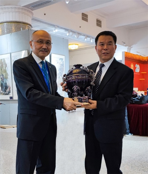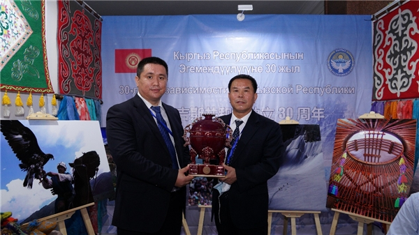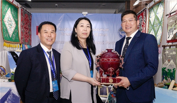 吉尔吉斯斯坦驻华大使巴克特古洛娃与高丙建大师交接《上合樽》