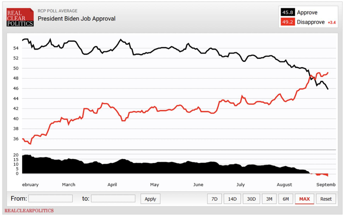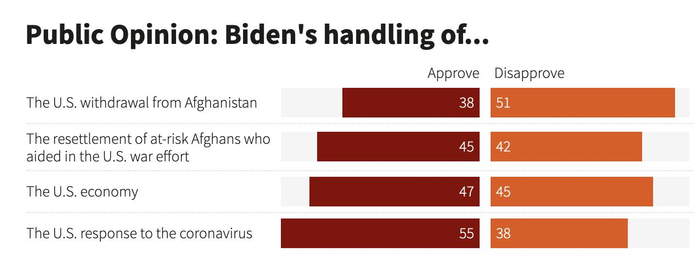 而据本周一公布的路透/益普索发起的最新民调结果显示,只有38%的美国受访者认同拜登对美军撤离阿富汗的处理方式。而根据美国REALCLEARPOLITICS在1日公布的民调显示,拜登的支持率下滑至45.8%,创下其今年1月上台以来的最低点。
