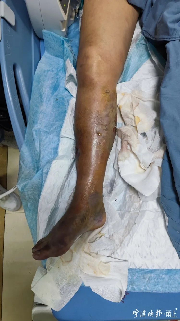 第四天,由120急救车转送到了国科大华美医院。她的小腿肿胀得非常厉害,有很多亮晶晶的水泡,不少水泡已经破裂,高烧39℃,并伴有心脏和肾脏衰竭。