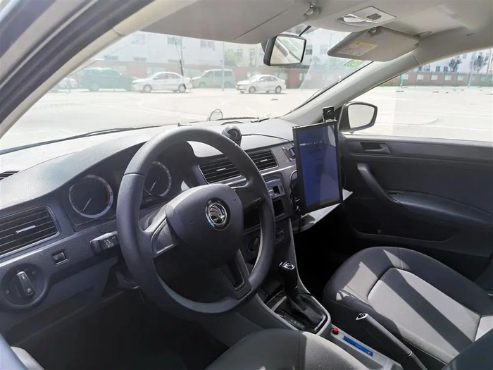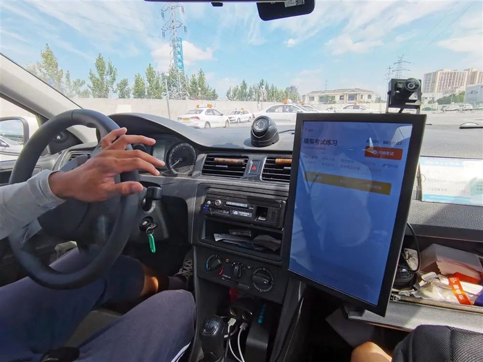 图为提供智能教学的教练车,车上副驾驶位置前方有一块竖着的液晶屏。
