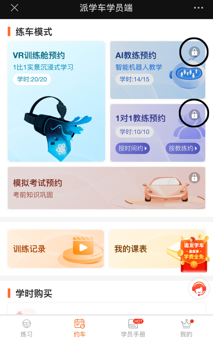 李女士发现,她的“派学车”小程序界面上教练预约模块已被锁定,只能选择新出现的20个学时的“VR训练舱预约”。