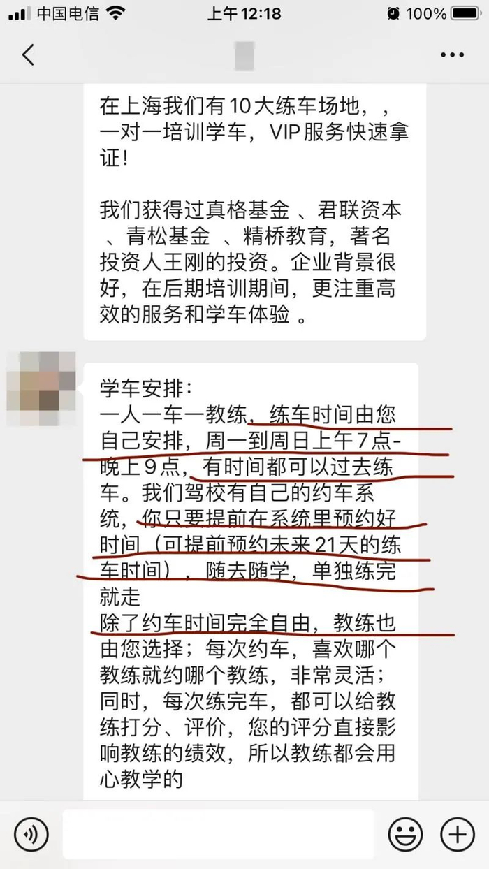 教学顾问向陈女士承诺:“10大练车场地”“一人一车一教练”“练车时间自由,提前21天预约”。