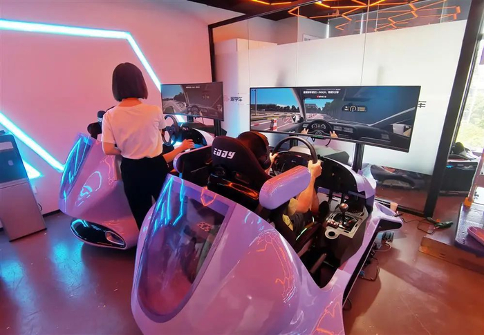 “派学车”灵石路的一处VR室内教学点内,学员正在模拟器上学车。