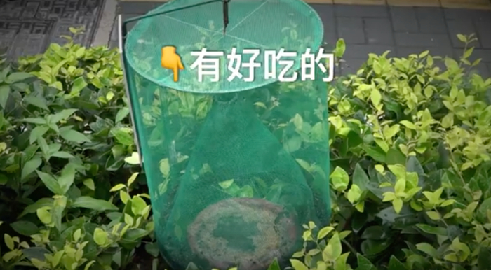超市外的草丛,她装上捕蝇笼,以食物作诱饵。