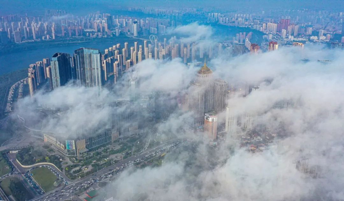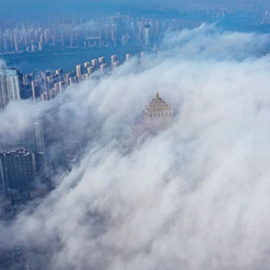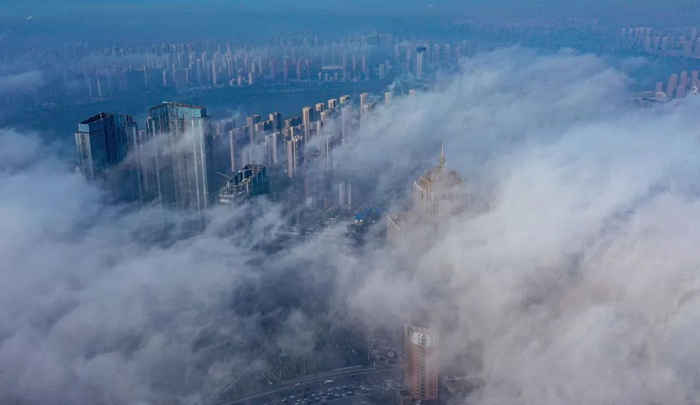 当日,沈阳出现大雾天气,城市楼宇在浓雾中若隐若现。