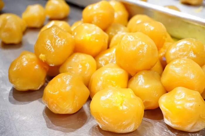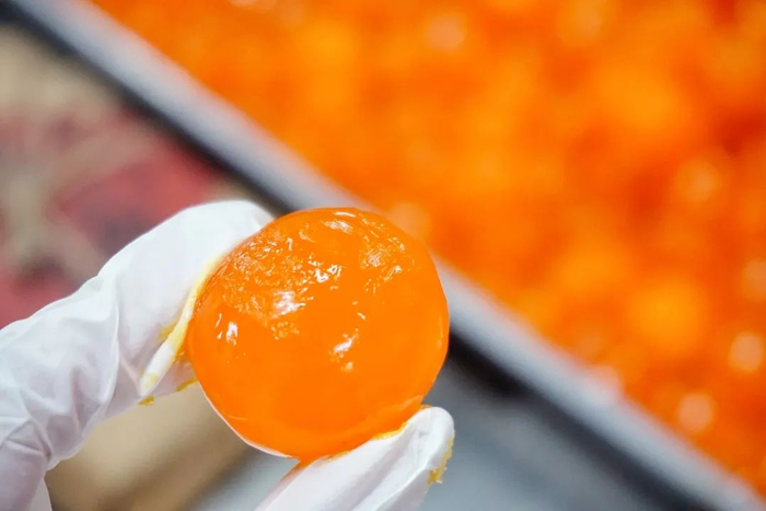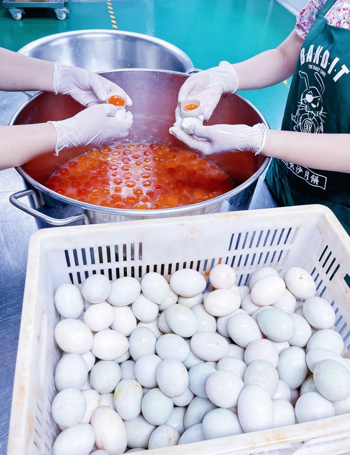 里面的颗颗蛋黄都是洞庭湖腌制3个月以上的咸鸭蛋,新鲜带土运输到长沙。