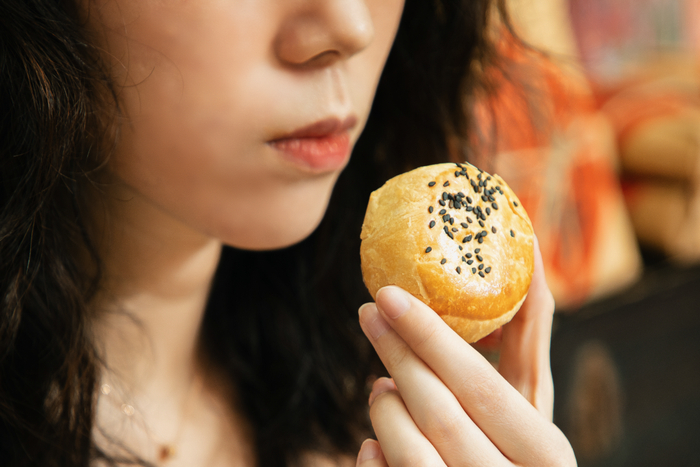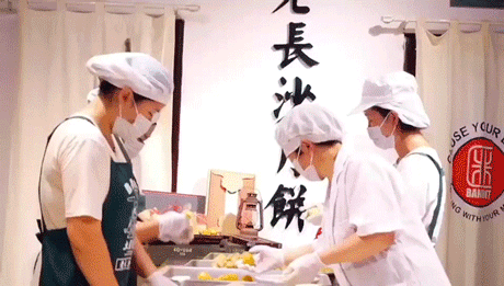 把层层扎实的材料逐步包裹、脱模、烤制,从头至尾人工完成,用心做月饼~