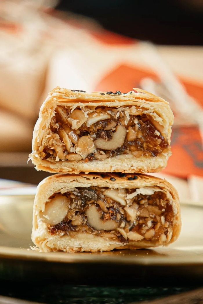 再瞧瞧兔匪货社酥到掉渣的本式五仁,金黄的酥皮之下藏着巨多的五仁馅料,入嘴丰富的口感能把人带上云端。