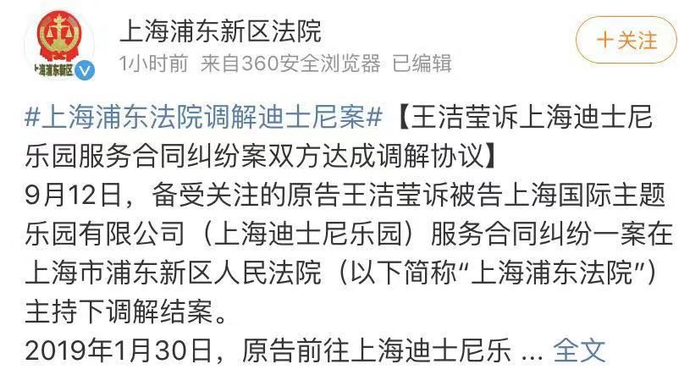 2019年9月12日,据上海浦东新区法院消息,双方自愿达成调解协议,被告上海国际主题乐园有限公司补偿原告原告人民币50元(当庭给付)。该调解协议已经双方当事人签收生效。