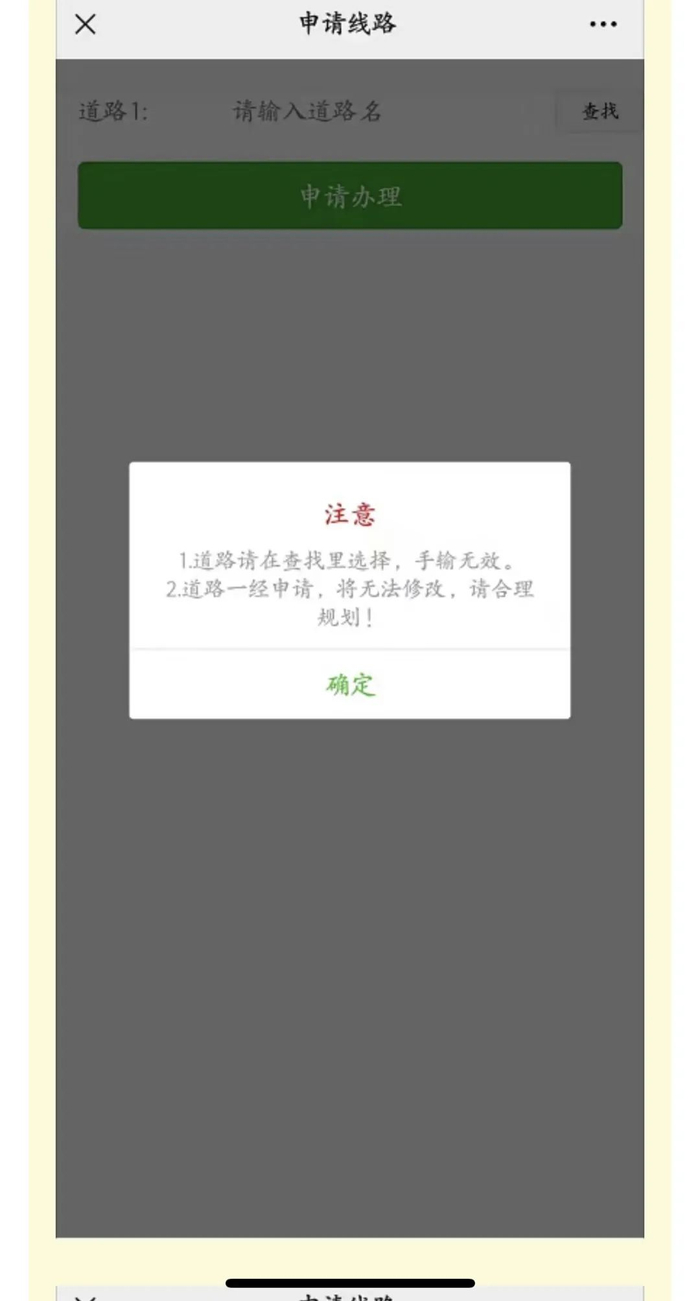 申请通行线路时,请输入道路名关键字点击“查找”,选择需要行驶的道路(手动输入无效)。道路一经申请,无法修改。若道路选择错误,可点击”删除”,重新输入、点击查找,选择相应的道路。